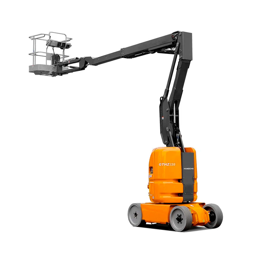 Esta máquina tem lança de articulação que pode trabalhar através do obstáculo. Pode transportar duas pessoas e algumas ferramentas na cesta. A máquina permite que você opere em um local limitado, com design estreito e sistema de giro de pequeno raio. Você pode operar a máquina a partir da cesta ou do controle da base, portanto, quando quiser movê-la, não precisará descer a máquina.